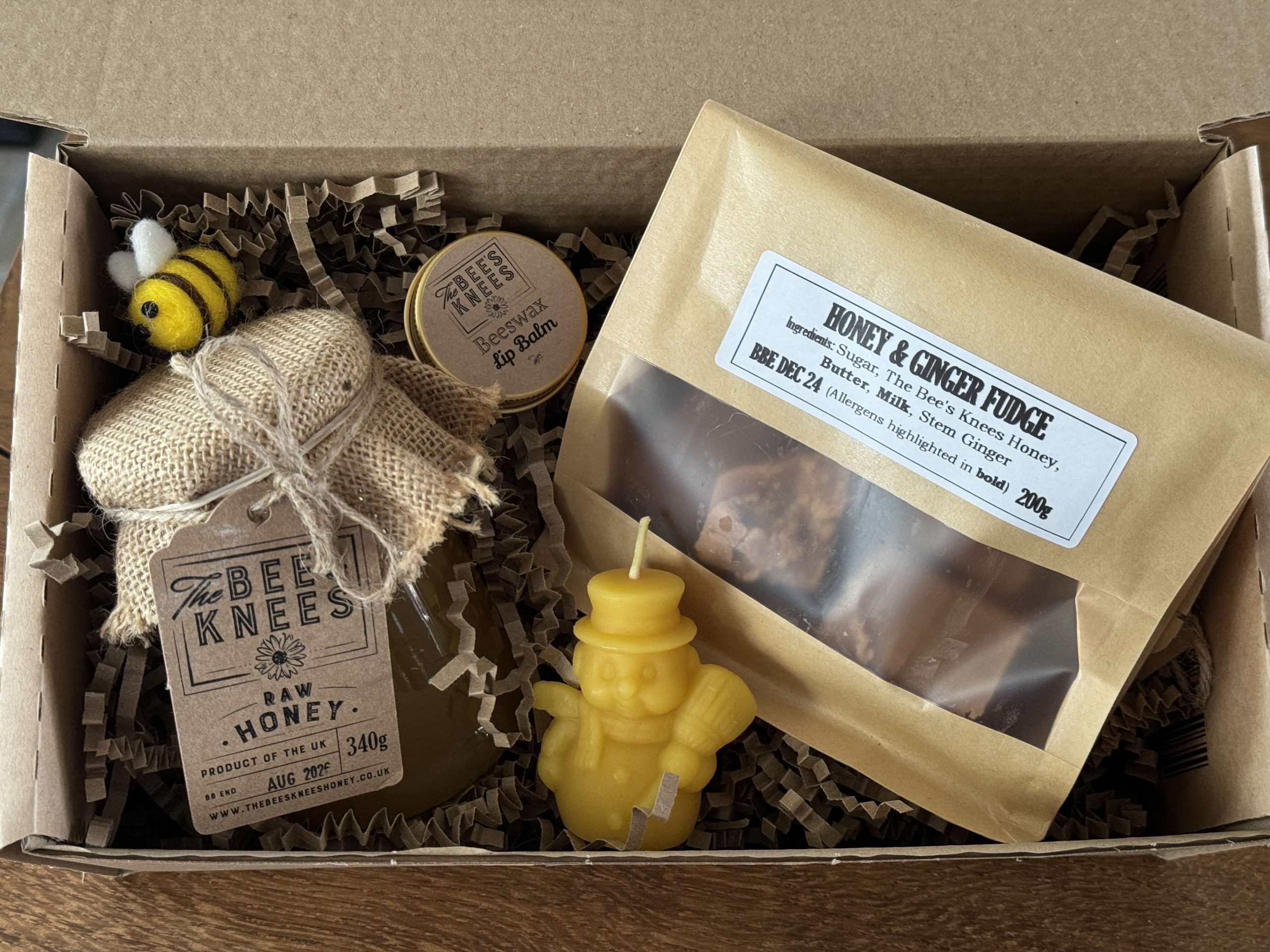 Contains a 12oz jar of The Bee’s Knees runny honey a 200g bag of honey fudge (Salted Honey or Christmas Pudding), a pure beeswax candle, beeswax lip balm (with just three ingredients: beeswax, cocoa butter and cold pressed organic rapeseed oil) and a little fuzzy felt bee.